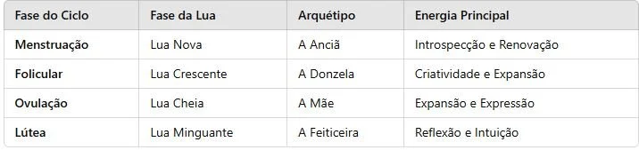 O ciclo menstrual geralmente dura entre 28 e 32 dias, semelhante ao ciclo lunar. Cada fase do ciclo está energeticamente conectada a uma fase da lua e a um arquétipo feminino.